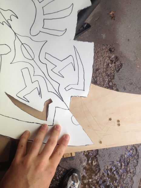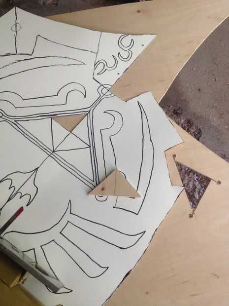 Ahora es el momento para cortar las pequeñas piezas que componen el centro del escudo. Para hacer los triángulos más o menos similares, había cortado a la mitad de uno, luego copian en el otro lado. Entonces usé ese pedazo para recortar tres triángulos más, descartar la primera de ellas. Hice lo mismo con cada una de las otras áreas elevadas, uno hacia fuera madera, cortando luego trazar los trozos de madera para cortar las piezas reales. Esto lo hice yo no daño el corte de cartulina outs, en el caso de que necesitaba para usarlos más tarde. Otra vez, algunas perforaciones en el que se coloque la Sierra de sable, luego cortar hacia fuera.