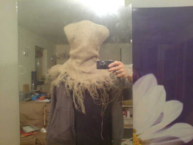 El Espantapájaros tiene muy pronunciadas las esquinas para la cabeza que parecen un poco de cuernos. Arrugado bolas de periódico para formar un bloque que se forma en las esquinas superiores de la cabeza y crear la forma. Crujir a tres hojas de periódico y aplanar de un lado para hacer una cúpula. Crujir de una hoja en una cúpula similar y pegarla al lado a la gran cúpula con alguna cinta adhesiva o pegamento caliente. El extremo de las cúpulas se pondrá en las esquinas de la cabeza, la cúpula más pequeña al lado siguiendo la costura, y el lado plano de la forma se sentará contra su cabeza. Aplicar liberalmente caliente pegamento de PVA sobre las formas y el palillo en las esquinas superiores de la cabeza.