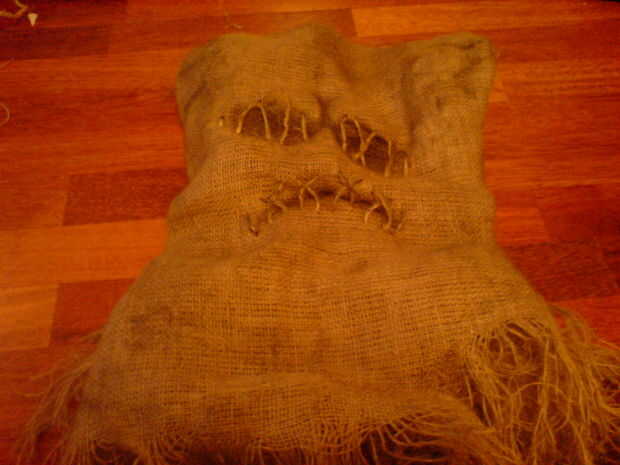 Tomar otra longitud de la cuerda de sisal extendidos utilizada para coser la boca y preparar un punto con cinta del conducto como antes para coser encima de los ojos. Puntadas sobre el ojo y asegúrese de mantener en el interior del ojo y no se extienden más allá de la cuenca del ojo. Si puede enhebrar la cuerda justo a través del material, entonces será fácil. Si tienes que coser a través de la máscara de ojo, así, hacer un agujero con un clavo afilado o una chincheta y abrirlo con un par de tijeras por lo que puede enhebrar el hilo a través de. Igual que antes, mantenga las puntadas cruzadas sobre el ojo en la parte exterior de la cabeza y pasa alrededor del ojo en el interior para conservar tanta visión como sea posible.
