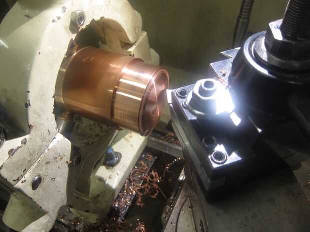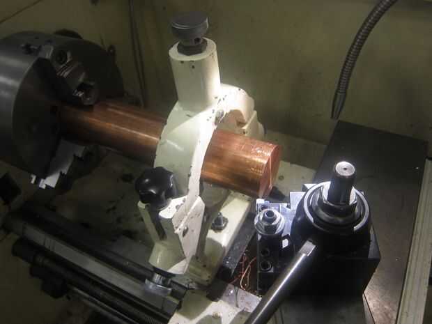 usé un resto constante porque el material estaba trabajando con era demasiado espeso para montar a través de la contrapunta del torno y demasiado largo para ser estable en su propio. En primer lugar a máquina la cara plana, entonces trajo el diámetro hacia abajo cerca de la cota final que estaba buscando, en este caso que terminó en 59 mm con el plan que la manipulación final sería 58,4 mm.