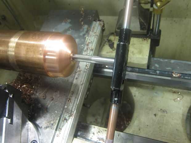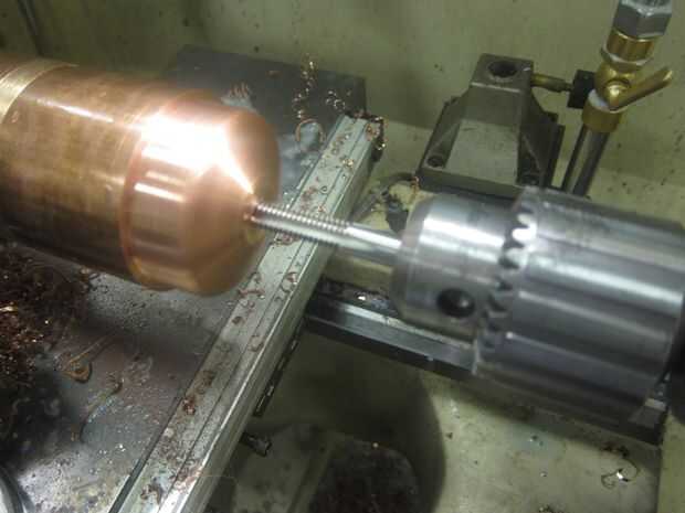 Comenzar con la toma de un portabrocas para que puedas estar seguro que es cuadrado, acabado a mano. El cobre es miserable para aprovechar, esto era la parte más irritante del proyecto. En el lado positivo, me puse a probar montar el asa luego.