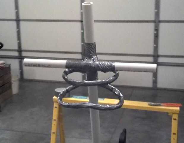 Las piernas fueron hechas de la misma manera que los brazos con 3/4" tubo y conectarse juntas en las articulaciones. La parte superior de las piernas están unidas por otro 3/4" tubo que es el ancho de su cintura. Esta pipa se rosca a través de la conexión en t atada a la columna vertebral. Os adjunto dos pequeñas abrazaderas a este tubo, uno a cada lado de la t. Esto mantiene las piernas y cintura centrada mientras que le permite girar en el tee.