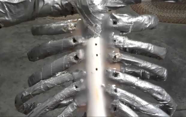 Las costillas fueron realizadas mediante cable eléctrico romex envuelto en periódicos, rígida con el alambre de percha y envuelto en un montón de cinta adhesiva. Sujeta cada costilla a la parte posterior de la columna vertebral pasando un tornillo a través del romex. Luego más tarde amplié los ajustando la columna vertebral de la madera como se puede ver en la foto. Esto no es necesario si se mide correctamente la primera vez.