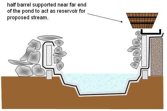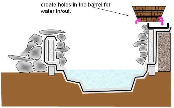 El barril debe apoyarse sobre el estanque. Esto se hizo mediante el uso de más rocas en el jardín.