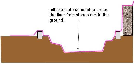 La capa inicial era sólo algunos arena edificio sharp, para ayudar a reducir caídas y crestas en el suelo y cubrir cualquier piedras que había perdido. Encima de la arena de que pongo abajo una capa de la charca fieltro que compré de un centro de la charca. Esto fue hecha de botellas de plástico re-ciclos. El rollo de fieltro no era lo suficientemente amplio como para cubrir el estanque entero de una sola vez, pero esto no importaba como se superpone ok. Cuando superpuestas me aseguré de que había mucho de él para asegurarse de que no te pierdas ni cualquier bits.