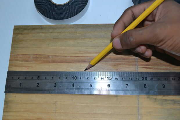 En este paso lo debemos hacer es tomar la regla y el lápiz, luego marcar el ancho y el largo de nuestra pieza de madera (imágenes 1 y 2).
