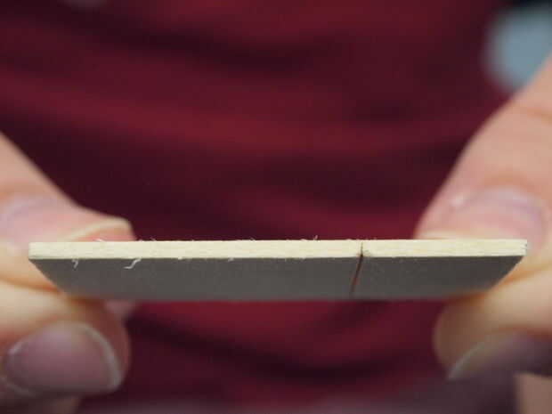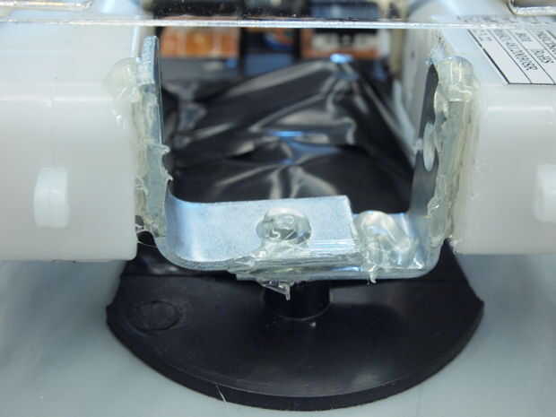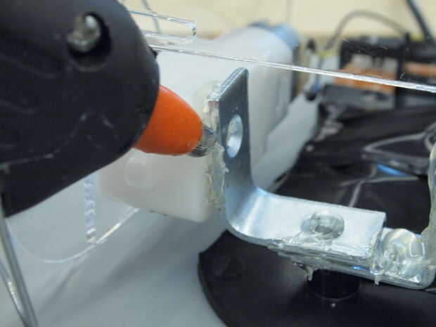 Se utilizaron dos soportes en L para la articulación trasera sellada con pegamento caliente que funcionó muy bien. Entonces hicimos los soportes de madera y cartulina del mínimo balsa de más en el frente, asegurándose de sellar la rotura de la madera de balsa. Estos apoyos fueron todos Unidos con pegamento caliente, aunque probablemente hay una forma mejor de adjuntarlos, precisión es difícil al no diseñar las piezas.