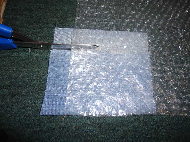 Sin incluir la aleta, recorta un trozo de plástico de burbuja que coincida con el tamaño del resto de la tela que cortar. Colóquela en el lado equivocado de la tela, burbujas de frente hacia abajo.