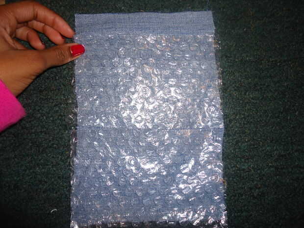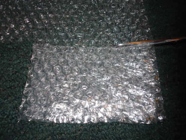 Abra el soporte del todo, para que pudiera ver el todo revés de la tela. Cortar otra pieza del abrigo de burbuja que se asemeja al tamaño del uno corte antes. Ahora debe tener dos piezas de burbuja wrap burbujas frente hacia abajo sobre el lado equivocado de la tela.