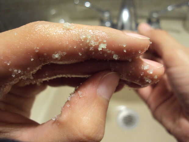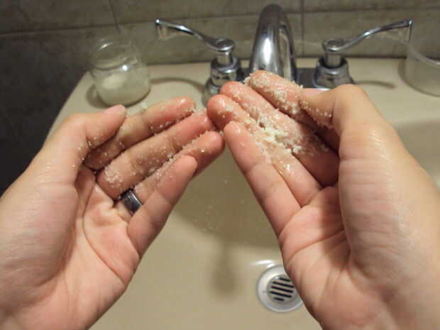 Ahora comenzar a restregar sus dedos y la mano juntos, usando el azúcar para quitar todas las cosas desagradables. Me gusta mucho esto, se siente cosquilleo y un poco como un masaje. Cuando sientes que has fregado bastante, enjuague sus manos y admirar sus manos limpias y suaves!
