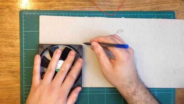 Empiezo trazando el contorno de un 120mm ventilador de la C.C. en un pedazo de cartón craft. Esta cartulina arte particular es alrededor de 3mm de espesor y está hecho de fibra de papel reciclado. Puede generalmente encontrar en una tienda de manualidades o incluso una tienda de suministros de papelería u oficina. Luego cortar el rastro y comprobar que cubre la cara entera del ventilador.