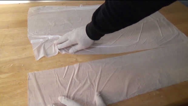 1) extender su bolso sobre la mesa y si es demasiado grande para que el balón entonces recortar algo de él, desea que la bolsa a terminar siendo como una sudadera con capucha. dos lados abiertos y dos lados cerrados.