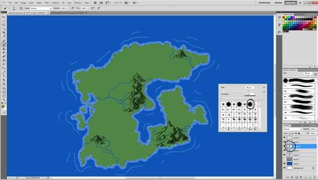 Para este paso se colorear el boimes del continente. Ctrl-clic la foto al lado del nombre de capa con el color verde original, si lo selecciona. Luego abren su pinceles y seleccione la ronda y a su vez la dureza hasta cero y el tamaño, generalmente alrededor de 400 pixeles, sino que puede extenderse a cualquier tamaño que usted necesitan para colocarlo.