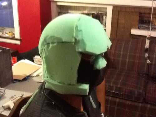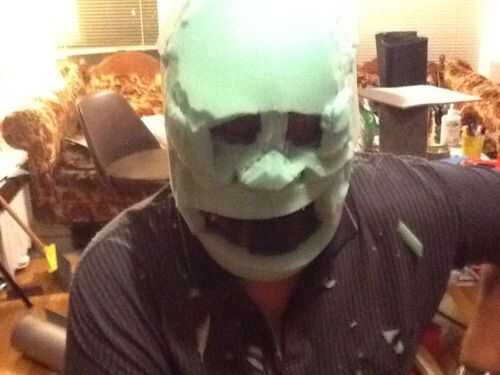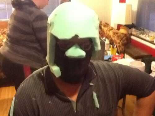 Para la cabeza... encontramos una antigua máscara de esquí y comenzó caliente espuma pega a él. ser cuidadosos acerca de lo caliente es, y qué tan cerca es a cara de su amigo!... por suerte, teníamos un cojín de la refrigeración (vino con la pistola de pegamento caliente), que poner en el interior de la máscara como hemos pegado.