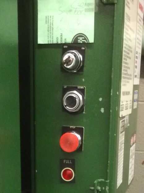 El primer paso para hacer un fardo de cartón es para asegurarse de que la máquina está en girando la llave. Cuando se enciende la luz plena, es el único signo de que la bala debe hacerse. Un fardo de cartón comienza con la fijación de la puerta de la jaula de la máquina y encienda el compresor completamente cuando el fabricante de la bala es bastante completo. El botón negro, que muestra en la figura, es para iniciar la compresión. El mismo botón negro también se utiliza para descomprimir la máquina girando el botón a la derecha hasta que la flecha llegue a la palabra "up". Hay un botón de emergencia que es el gran botón rojo que muestra en la figura para parar la máquina inmediatamente en caso si algo fue colocado bajo el compresor que no se supone que en ese lugar.