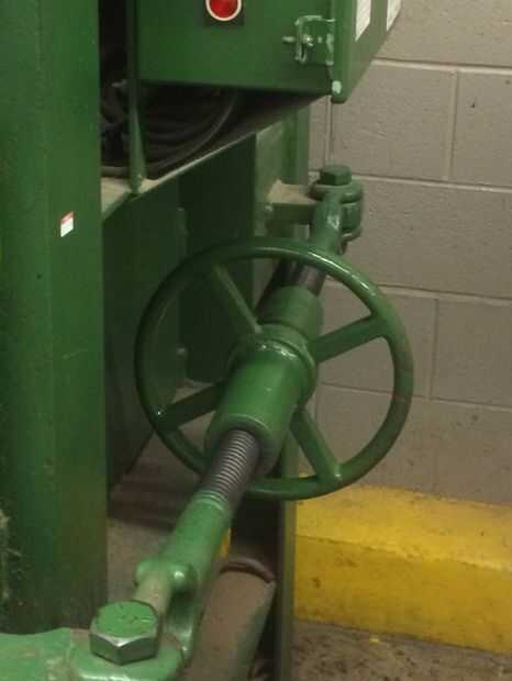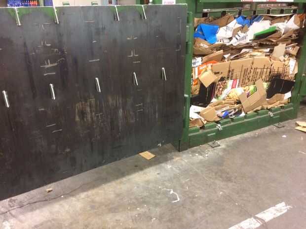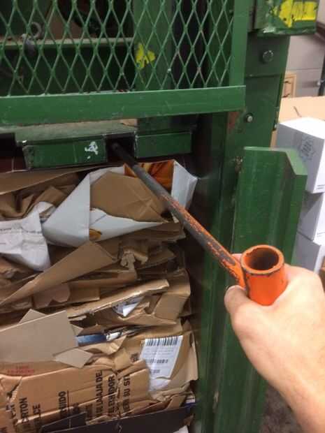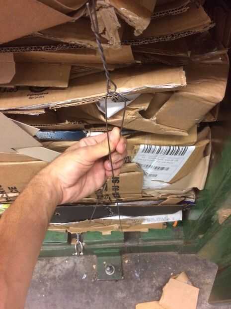 Después de comprimir las cartulinas dentro de la máquina completamente, el operador da vuelta la rueda verde que muestran en la figura a la derecha y abrir la puerta de la máquina hasta el final. Al abrir la puerta, reconocemos 7 apertura pista de aberturas en la parte superior y la parte inferior de los cartones comprimidos. Descuidar las aberturas de segundo y sexto, el operador tendría agujeros a través del resto de las pistas de apertura. Haciendo los orificios se realizaría mediante el uso de un tubo de acero, ya que las aberturas están cerradas que causado por las cartulinas. La persona que hace la bala funcionaría cinco cables de acero a través de los cinco agujeros, que habría sido hechos, en la parte posterior de la máquina y ejecutar volver otra vez a través de los orificios de la parte inferior cinco al frente de la máquina. No lastimará a correr los cables en la dirección opuesta porque el paso es envolver la bala del cartón. La siguiente cosa a hacer es envolver los extremos de cada alambre de acero juntos. Mientras que envolver los cables de acero, la persona, cuya fabricación de la bala, debe asegurarse de que los cables son envuelto no demasiado floja o demasiado apretada ya que hará que los cables hacer estallar para arriba y podría herir a alguien al levantar el compresor. Este paso es muy importante y debe hacerse correctamente.