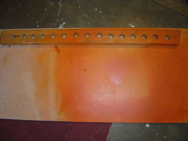 Que el taladro esté como posible nivel. (Un taladro hará esto mucho más fácil.) Esto hará que venga tu estera hacia fuera mucho más agradable. Ahora tienes un 2 x 3/2 x 4 con 13 agujeros uniformemente espaciados en el tablero. Ahora atornillar que 2 x 2 x 3/4 cerca del borde de los 1'6 "x 3' pedazo de madera. Su plantilla debería verse algo como la foto abajo.