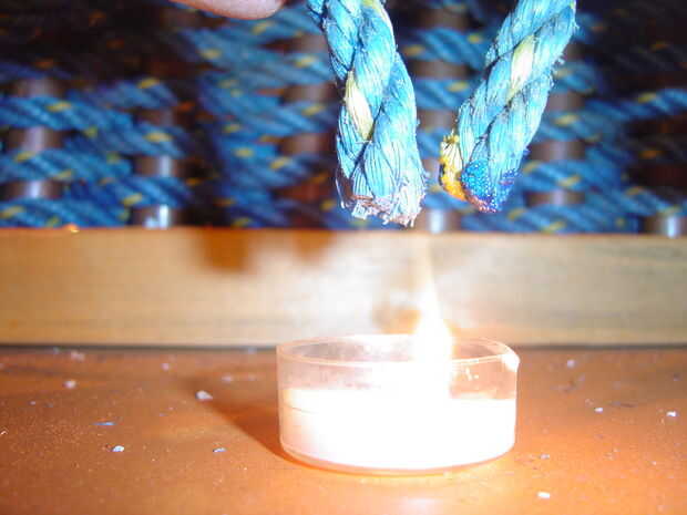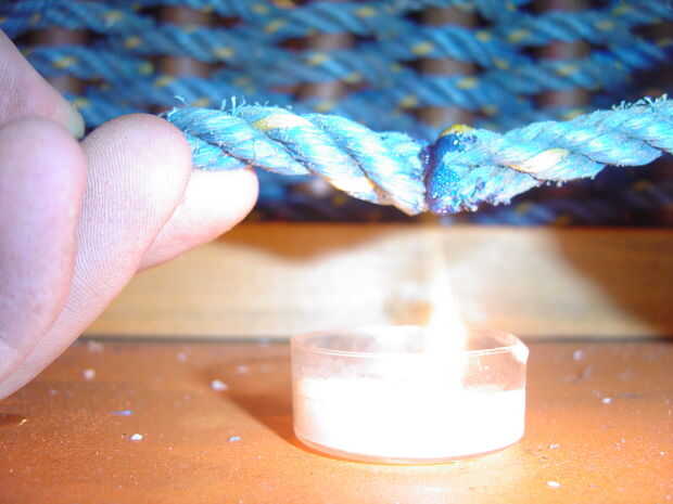 No importa qué, usted necesitará fusible cuerda por lo menos una vez al mismo tiempo que un felpudo. O puede fusible 6 o más veces dependiendo de cuántos diferentes piezas de cuerda usas. Tomar una vela y los 2 extremos de la cuerda y mantenerlos 1-2" de la llama. No deje que los extremos coger el fuego o que se convierten en negro y aparece en las esteras. Además huele mal. Cuando los extremos aparecen fundidos, les pegan y mantenga durante 15-20 segundos. El fusible debe ser bastante difícil de trabajar con entonces. Utilizar las fotos para obtener una mejor comprensión.