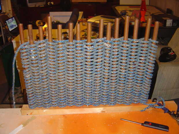 Una vez que han conseguido el mat 20-26 filas de alto, es hora de quitar de la plantilla. Para retirarlo, quitar la plantilla de las sillas o mesa y coloque en el piso. Ahora paso en el tablero y tire de los tubos para eliminar de los orificios. Debe empezar en un extremo y trabajar su camino a la otra. Tenga cuidado de no tirar los tubos fuera de la cuerda. Usted debe dejar con lo que parece la imagen de abajo.