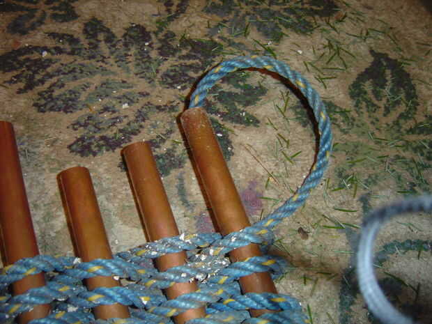 Quiere asegurarse de que los extremos de la cuerda están enfrente uno del otro. Si no está seguro de lo que quiero decir, ver la imagen en el paso 6. Ahora pienso el extremo de la cuerda por el extremo del tubo (ver foto abajo) y tirar completamente a través del tubo. Ahora tire del tubo de los "niveles" de cuerda y tirar la cuerda vuelve a salir por el tubo. Ahora tire de la cuerda autodidacta pero no demasiado apretado. Desea que la estera para quedarse tan rectangular como sea posible. ver fotos de abajo.