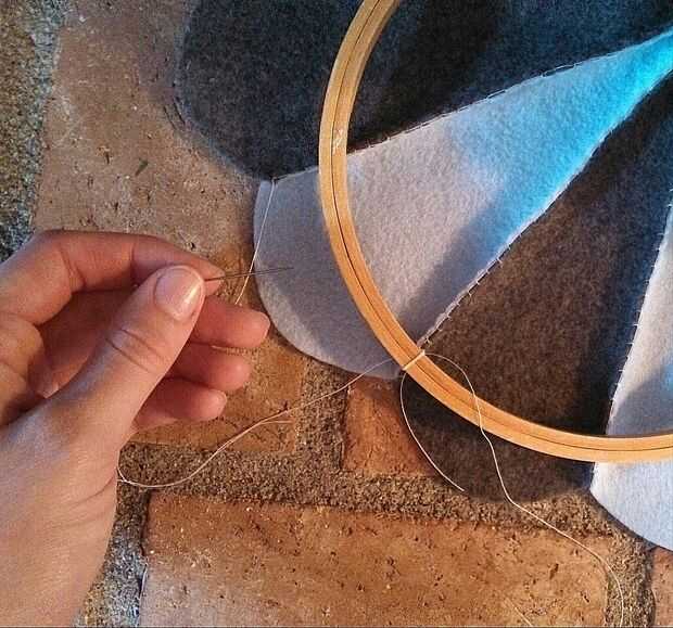 Coser el círculo bordado en el interior de la tienda de fieltro con una puntada del azote, en el interior esquina de cada pieza y firmemente alrededor del círculo bordado. Reforzar la puntada varias veces, una vez no se garantiza para mantener lo