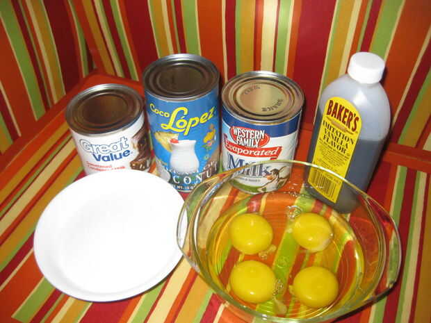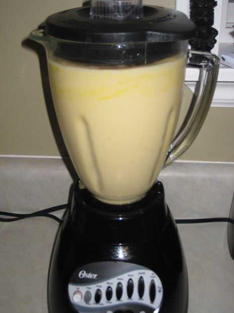 Combinar en la licuadora, los huevos, crema de coco, leche evaporada, leche condensada y la vainilla .