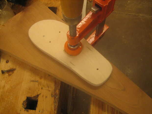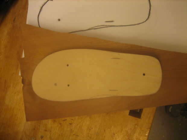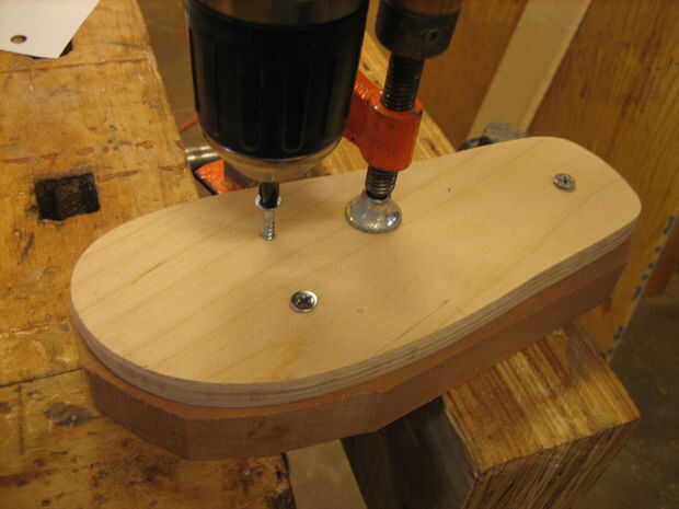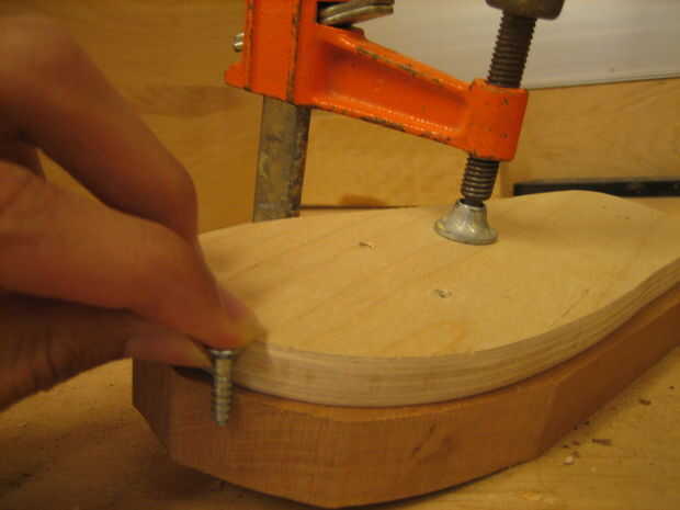 Taladrar los tornillos de fijación las dos piezas de madera juntos firmemente. No te preocupes de atornillar para arriba el aspecto de la madera. ¿Se volcó, recuerda? Trace la plantilla sobre el flip-flop-a-ser y quitar la pinza, pero no los tornillos.