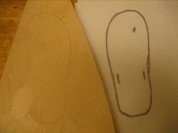Coloque el pedazo de papel (originales marcas hacia arriba) en el trozo elegido de madera. Con tu lápiz, traza sobre la forma de lo flip-flop, asegurándose de que presione hacia abajo con una cantidad razonable de fuerza.