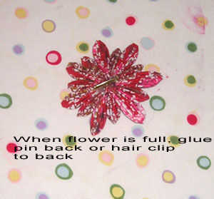 * Punta-sí, habrá un agujero. Está bien. Esto permite que su flor más circular y de aspecto regular. Nos ocupamos con el agujero de esta manera: se llenan de gota de pegamento caliente, cubierta muy lateral con un botón, lentejuelas grandes, fieltro flor, tapa de la botella, diente golpeado-hacia fuera, Foto de su perro, un penique, una roseta de cinta, nada. Y su clip de pelo detrás del pin en la parte posterior de la gota de pegamento, así anclar firmemente y con seguridad en la suave caricia del pegamento caliente.
