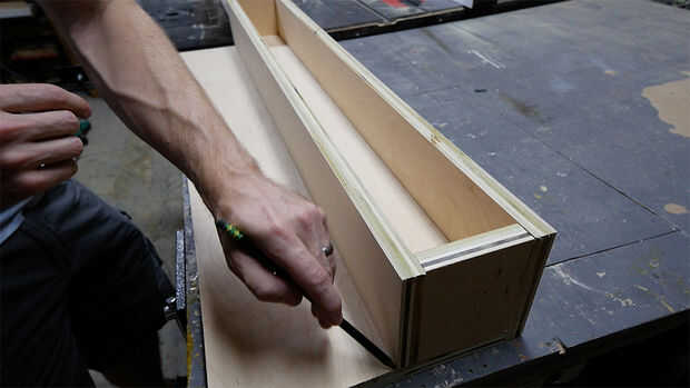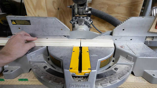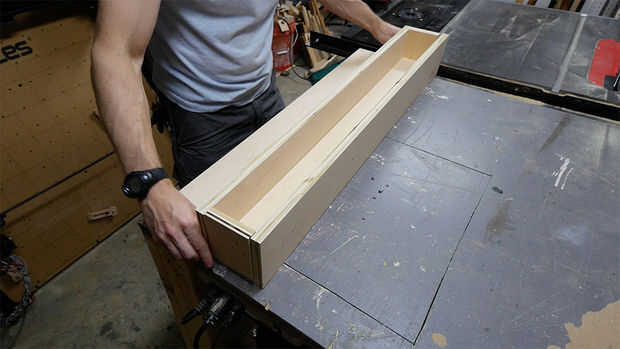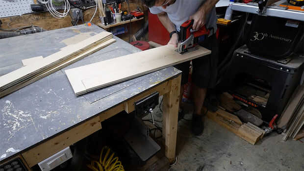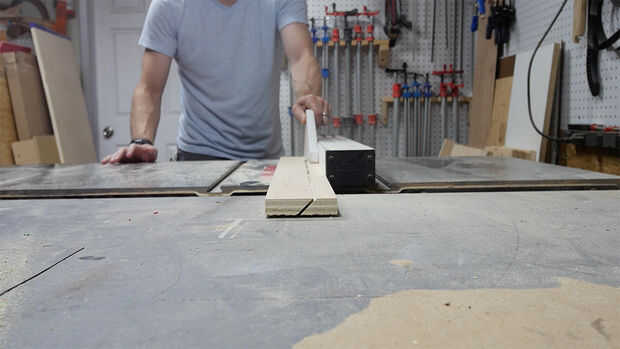 He marcado a lo largo de la parte inferior del cubby para no cortar por debajo de esa línea. Entonces yo cortar una sección grande que estaba detrás del compartimiento. Puse mi sierra de mesa a 45 grados. Entonces, usando el corte desde arriba, dividirlo aproximadamente en la mitad. Una de estas piezas consiguió recortar hasta 20" de largo, para convertirse en la Cala de la pared. La longitud más corta es que la plataforma se deslice hacia adelante y hacia atrás en ella.