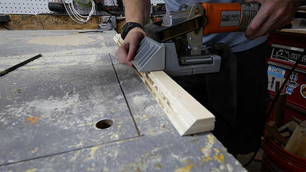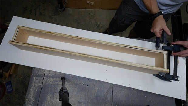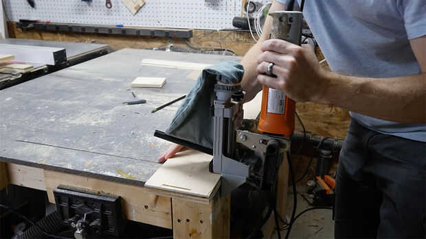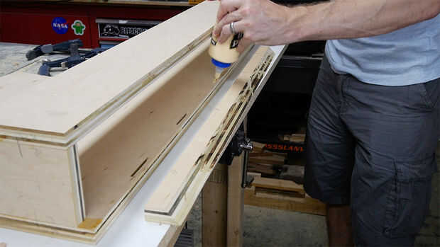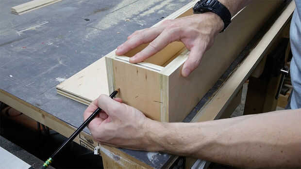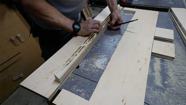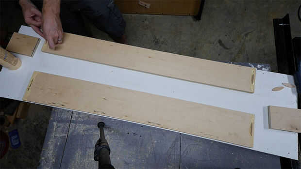 También establece la Cala restantes en la parte inferior del panel superior y marcado para galletas. Con una empalmadora galleta, agregó ranuras en todas las piezas necesarias. Marca todas la piezas ayuda a hacer que se alinean las ranuras galleta. Agregar pegamento a todas las ranuras y caras comunes, luego agregar galletas en las ranuras. Toda la galleta paneles articulados se sujetaron a secar. El ángulo de la cuña hace difícil a la pinza, así que pegué justo en el lugar. Para la articulación galleta, basta a la línea de la marca que hiciste, que debe cruzar la articulación.
