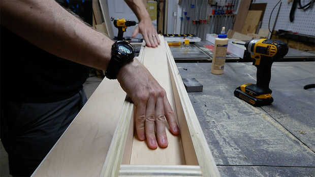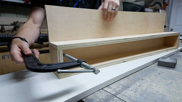 Con él volcó, agregué pegamento en el interior de nuevo las superficies. Entonces empujé en el panel posterior en la medida en que iría. He añadido algunas abrazaderas de garganta profunda para forzar el panel contra la parte trasera para secar.