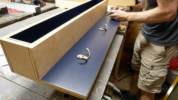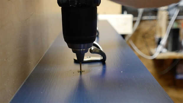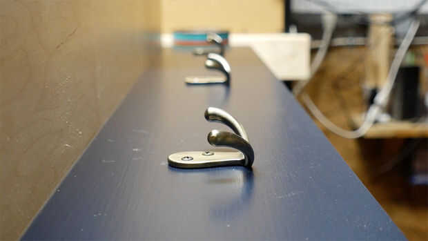 Luego presenta ganchos centrados en mis marcas. Taladraron previamente los dos agujeros en cada percha, así el tornillo no deriva cuando está atornillada en. Entonces todos tres anzuelos se atornillan en lugar.