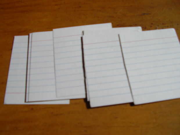 En primer lugar, cortar todas las tarjetas de índice que va a utilizar en la mitad. Si el uso de tarjetas de índice de 4 por 6, ahora debe ser 4 por 3 y lo mismo con las tarjetas de 3 por 5.