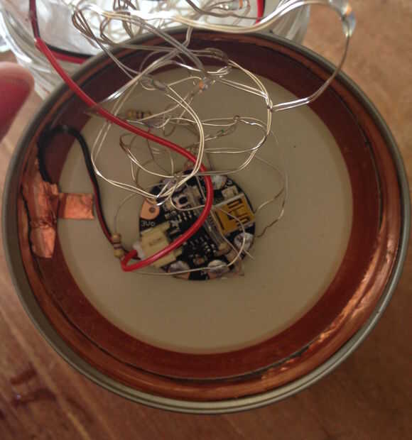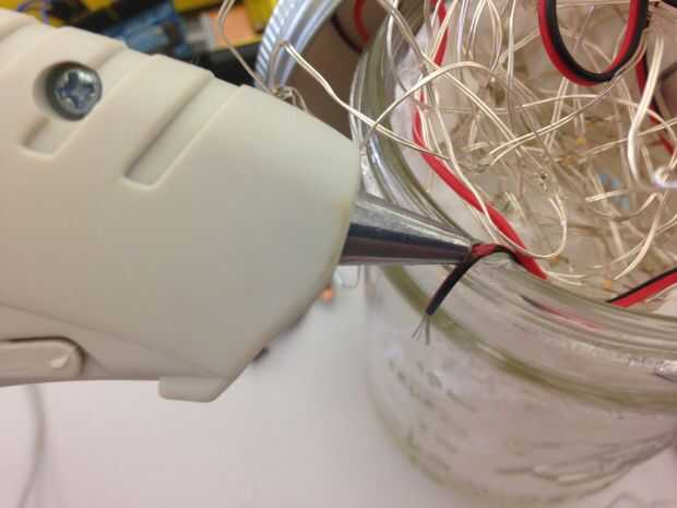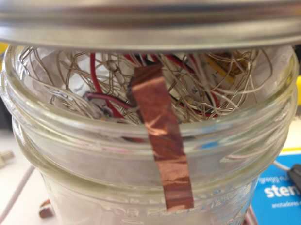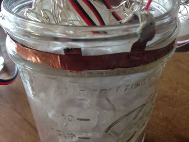 3. lugar que cobre cinta en el borde del vidrio jar como se muestra y luego caliente del pegamento a la cinta de cobre alrededor del borde de la jarra.
