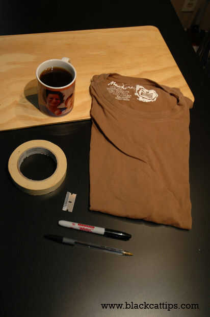1 . Primero necesita los siguientes elementos: una idea, cinta de enmascarar, hoja de afeitar, sharpie pluma, bolígrafo, Junta lisa o superficie de corte, camiseta y taza de café.
