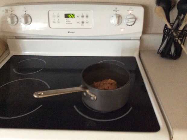 Abierto la lata de frijoles usando lo abrelatas de poder establece su fogón en un 6 o 7. Entonces puso sus frijoles en la olla entonces sobre la estufa.