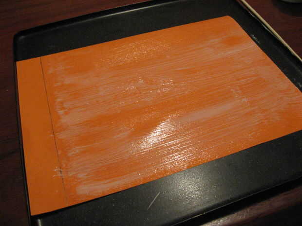 Dejar de lado una plana para hornear la bandeja con la pieza A4 de papel en él y un molde con 2 cucharadas de pegamento PVA madera en él.