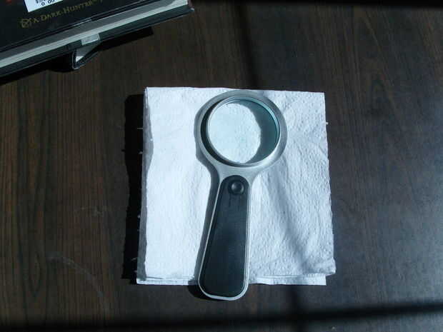 Sujete la lupa sobre el iniciador de fuego para que el rayo se concentra en él y espera hasta que prenda esto tiene una mano muy firme.
