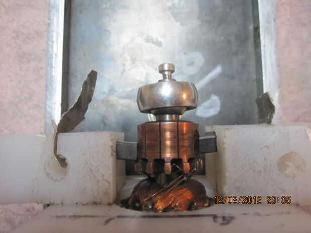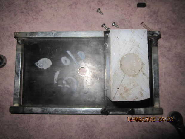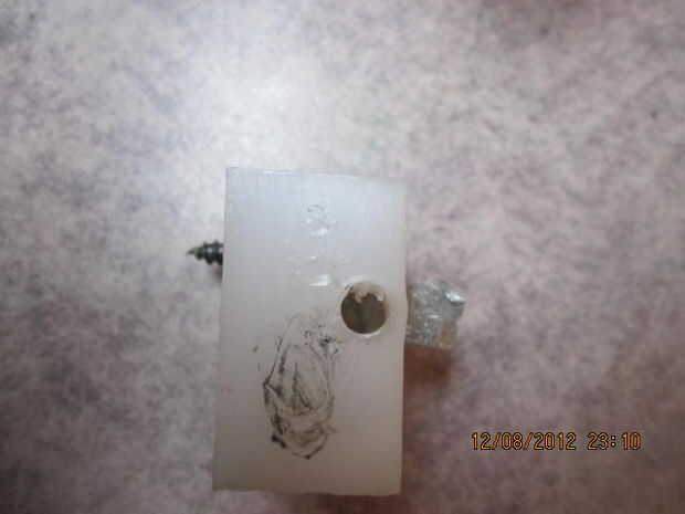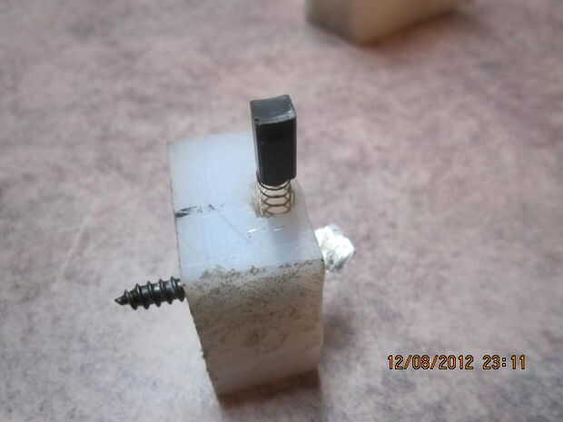 bien que lo... casi en orden para que el motor funcione necesita energía y algo para transferir la energía a la bobina. las escobillas!!!! Ahora usted necesita montar los cepillos para esta parte no hacer cualquier cosa especial taladré un agujero en un plástico de desecho sólo lo suficientemente grande como para introducir el muelle y cepillo luego, corte una ranura en el plástico que desciende hasta el agujero luego deslice en los pedazos de lata hasta el muelle presiona el cepillo y la lata cuando su en la bobina entonces jodido que el bloque