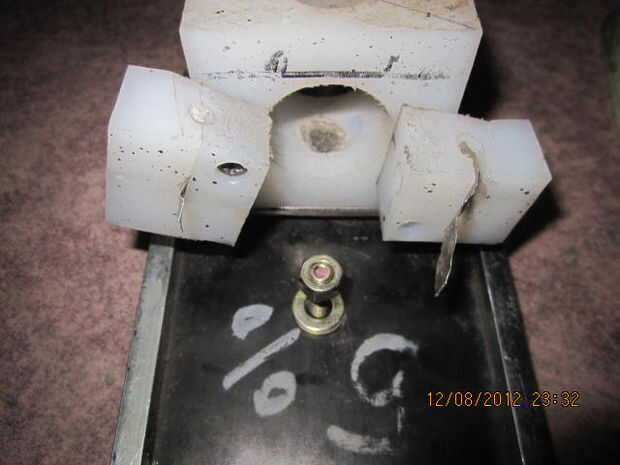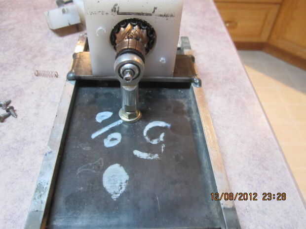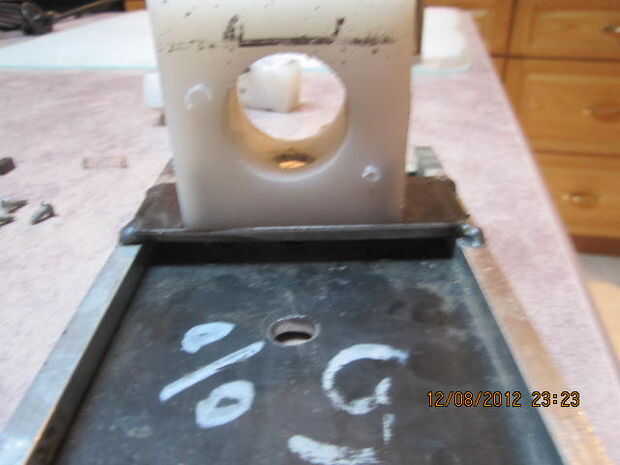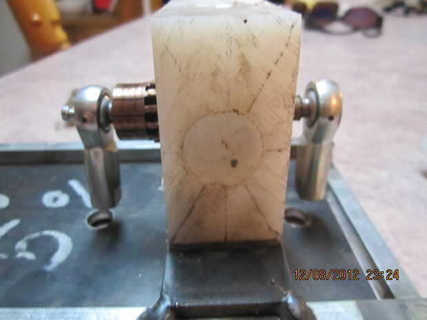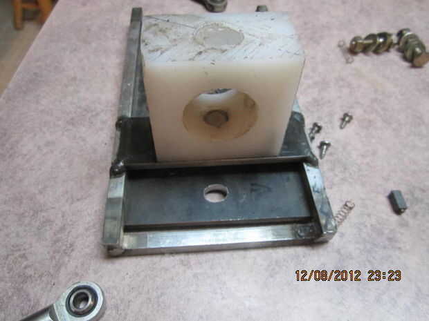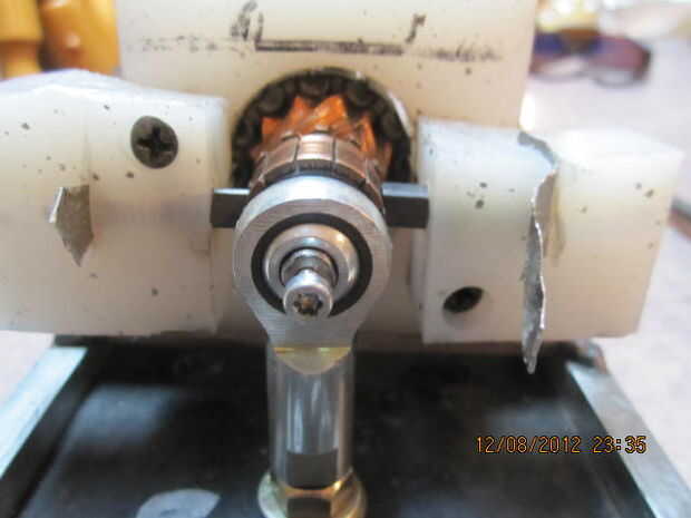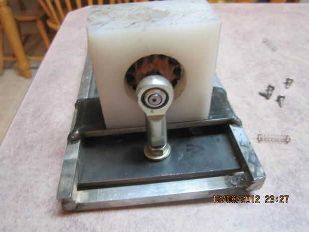después de que la silicona se seque, coloca sobre la pieza metálica que se corte al ancho del bloque y atornille firmemente pero no tira el bloque ahora situado en la bobina del motor temporalmente para marcar directamente por debajo del extremo del eje en ambos lados ahora quitar la bobina y el taladro un agujero fueron marcó con un poco más grande que el tornillo para que tenga un poco de movimiento para ajustar la bobina del motor a obtener el centro con ninguna fricción en el plástico. ahora ponga su bobina de motor en el bloque, deslice los extremos de barra de lazo en los ejes de la bobina. poner una arandela en el tornillo y ponga a través de la placa después una o dos arandelas más luego la tuerca y luego la rotula de direccion. hacer esto a ambos lados. la utilice movimientos leves de centro la bobina en el bloque así que giran libremente en el bloque, hacerlo apretado a mano hasta que ambos se tienen que ser. Ahora toma un par de llaves y el perno de la cerradura (qué quiero decir con esto es girar la tuerca hacia abajo hacia la placa con una llave y gire el perno para arriba con la otra.