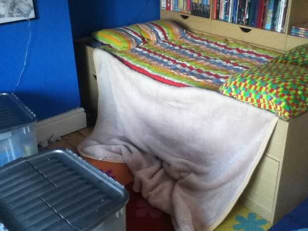 Cuando empiezas a hacer el techo necesita meter un lado no la cobija en el lado de la cama. Posición de las cajas frente a la cama donde escondida a la manta.