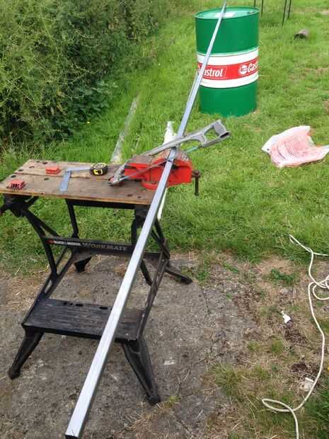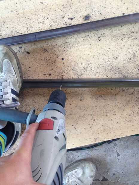 Cuando juntos se unen las dos partes del bastidor, el marco tiene posicionamiento en el lugar correcto para el tambor de aceite descansar en la parte superior. En este momento no hay nada para evitar que la estructura caiga plana. Lazo de dos piezas de cuerda alrededor las mitades superiores de la estructura para dejar la estructura caída plana. 4 piezas de barra de acero necesitan soldadura a la estructura por encima y debajo de la bisagra. Esto formará la parte inferior un mecanismo para sostener el marco en el ángulo correcto de la apertura. Cuando el marco se cierra lo pliegues plana.