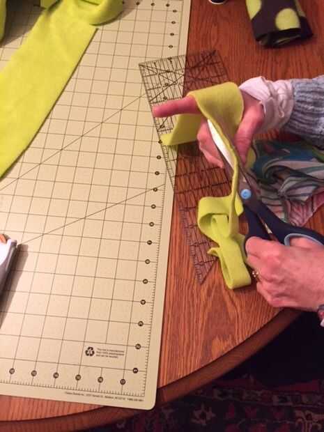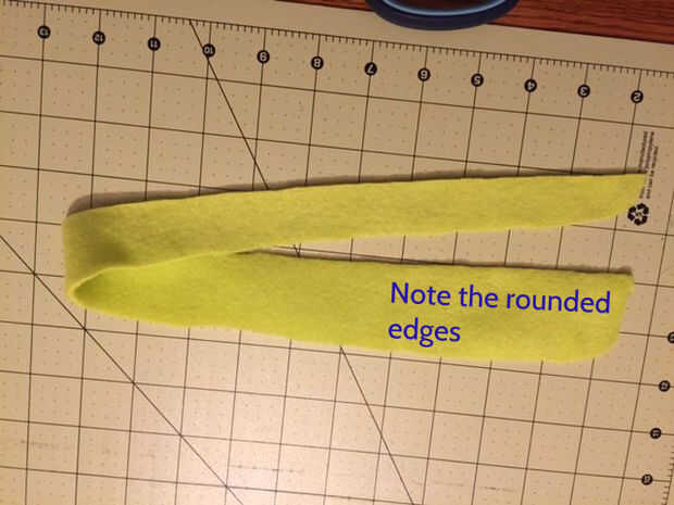Entonces, usando las tijeras, de la forma cónica la tira (sólido de la tela) de unos 1/2" de ancho en un extremo. En otras palabras, la tira acabada debe quedar 1/2" ancho, poco a poco consiguiendo mayor hasta llegar al otro extremo de la tira (que será 2" de ancho).