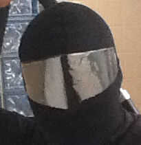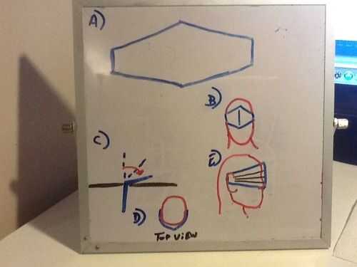 Tomar el arma de la calefacción y calentar el diamante en forma de plexiglás... Que había encajada la pieza entre dos mangas de una mesa y empecé a doblar por la mitad, por lo que parecía una "L" (pic C). Tenga cuidado para asegurarse de que el vidrio del plexi es cálido y enganchará. Una vez que esté frío, caliente los lados y los de la curva, así... debe tener una curva agradable (Foto D) que se ajuste alrededor de su cara.