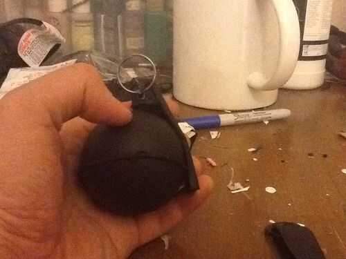 montar las piezas de cartón juntos, (la tira se abrigo en la parte superior)... pegamento caliente el gatillo todo cartón a la parte superior del ornamento. Tomar la "tapa" que cortó la parte superior y pegar al lado. Poner un llavero a través y tienes una Granada. PLUMA DE.