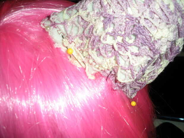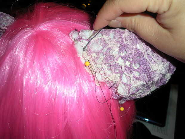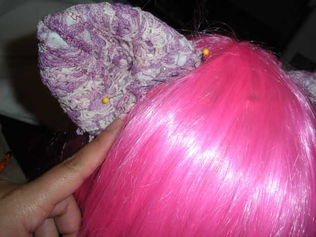Parte el cabello como mejor puede y perno de la parte posterior de las orejas a la peluca usando las clavijas rectas. Se necesita 2 pins en cada punto y medio para sostener el oído mientras cose. Un poco abrir la parte delantera de la oreja y tire hacia adelante al oído de forma.