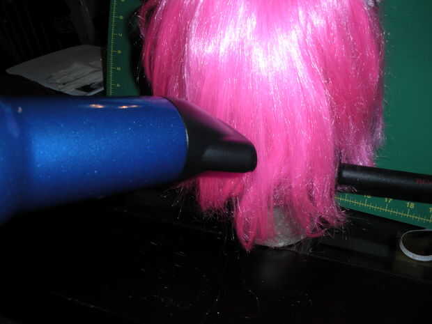 Usando un secador de pelo a fuego medio con la temperatura baja, enderece la peluca y el estilo. Encontré éste en el recipiente de $1,00 en la tienda y tomó un tiempo conseguir que desenredar. Ser paciente y trabajar desde abajo para arriba si es el caso.