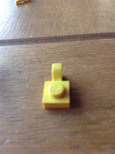 Toma la última pieza de gancho de 1 por 1 y ponerlo delante de usted, el anzuelo mirando hacia fuera. Tomar la pieza grande 1 por 1 con el punto en el lado y colocar en la pieza de gancho plano 1 por 1 como en la foto.