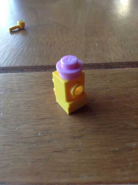 Tomar un color de rosa 1 circular por 1 precio y conéctelo a la parte superior de la pieza grande de 1 por 1 con el punto en el lado como en la foto. Para los oídos, tomar la pieza 1 por 1 con un gancho en la parte superior y ponerla en el perno en el lado de la pieza grande de 1 por 1 como se muestra en la imagen.